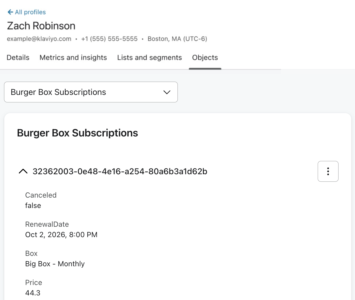 Klaviyoのオブジェクト ページに、以下の情報とともにオブジェクトが表示されます: