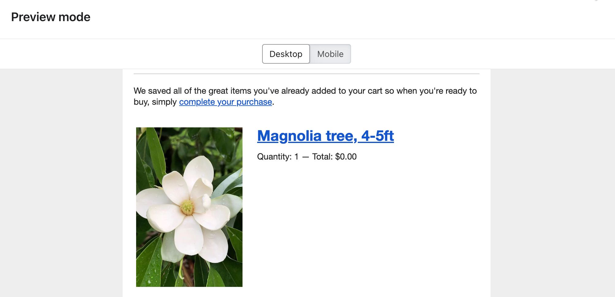 {{ event.extra.line_items.0.title }}が{{ item.title }}になります。 - メールをプレビューして、タイトルが表示されていることを確認してください。表示されない場合は、スペル、大文字・小文字の区別、書式設定に間違いがないか再確認してください。また、[スタイル] タブの設定にエラーがないかも確認してください。
