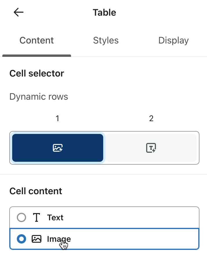- [セルセレクター] と [セルコンテンツ] フィールドを使用して、左側のセルを [画像] セルタイプに設定します。