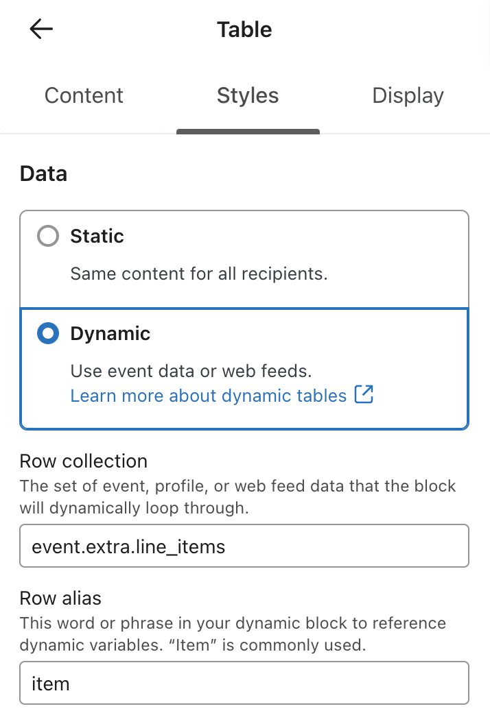- [スタイル] > [動的] をクリックして、テーブルを動的ブロックに変換します。[行コレクション] と [行エイリアス] の 2 つのフィールドが表示されます。これらはステップ 3 と 4 で入力します。
