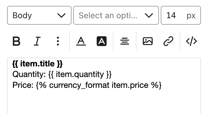 テーブルブロックの繰り返し表示に必要な詳細情報を含んでいるため、より詳細な配列である [line_items] を使用することをお勧めします。[行コレクション] フィールドに設定する適切な変数を見つけるには、配列の最初のセクション内にある 2 つの変数を選択してコピーしてください。この例では、[variant_price] と [title] のタグをコピーします。以下はこの例の 2 つのタグです。