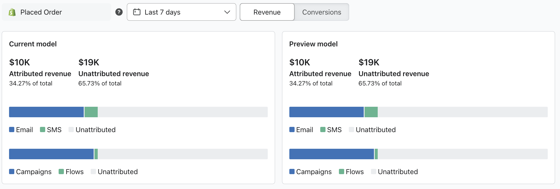 Klaviyo 어트리뷰션 및 기타 비어트리뷰션 수익이 각 마케팅 채널에서 어떻게 조정되는지 검토합니다. 이 섹션과 왼쪽의 현재 설정 섹션을 비교하여 설정을 조정할 때 성능이 어떻게 달라지는지 확인하세요. -
