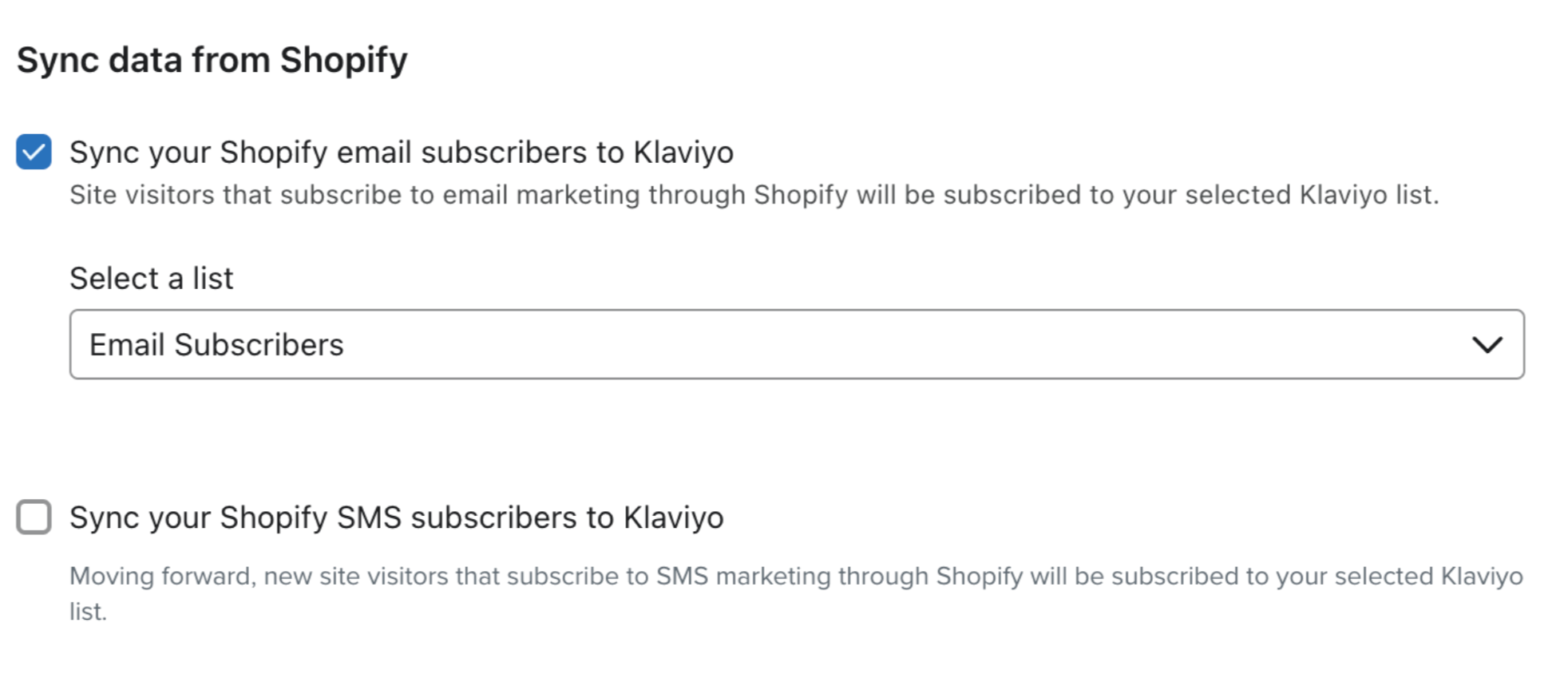 Klaviyo Shopify 이메일 구독자를 Klaviyo 으로 동기화를 체크하면 과거 이메일 구독자가 자동으로 동기화됩니다.