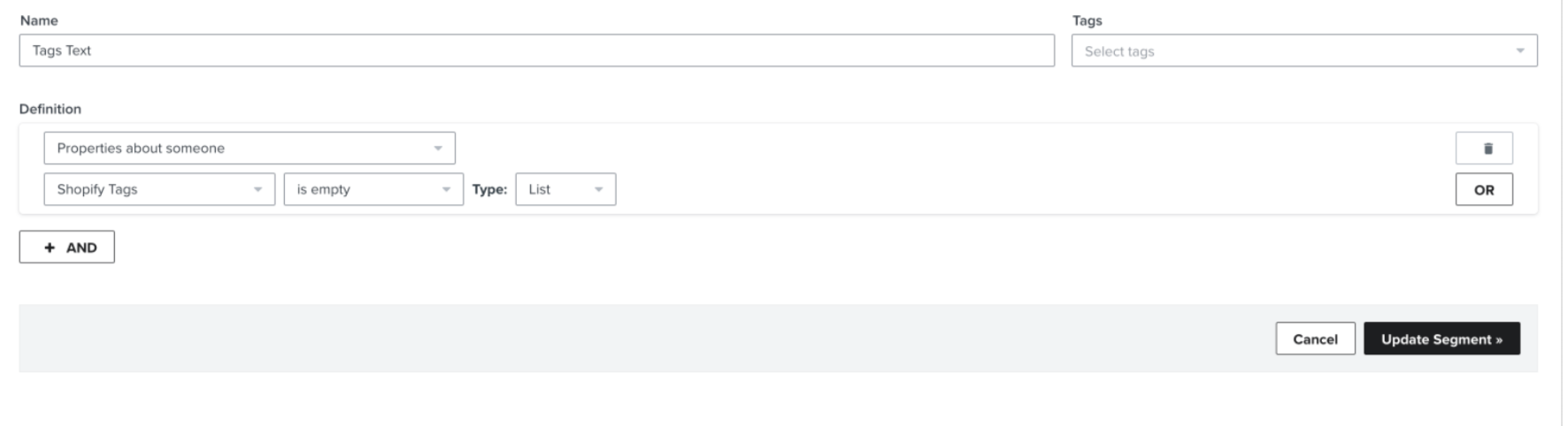 특정 Shopify 태그와 연결되지 않은 사용자 세그먼트를 생성할 수 있습니다. 이 세그먼트를 만들려면