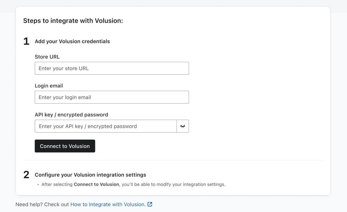 - 다음 페이지에서 스토어 URL, 로그인 이메일, API 키/암호화된 비밀번호를 입력합니다. 그런 다음 Volusion에 연결을 클릭합니다.