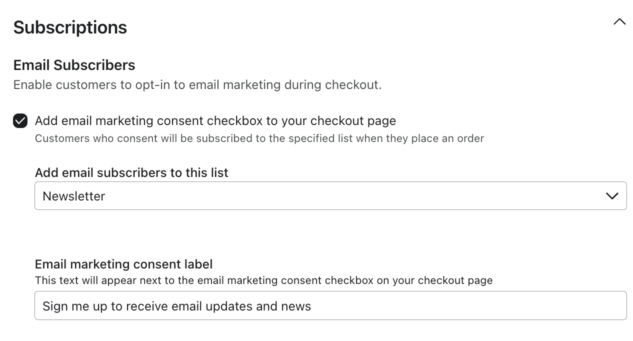 결제 시 확인란을 통해 구독하는 모든 사람이 이 목록에 추가됩니다. 고객이 결제 중에 주문 제출 버튼을 클릭하면 동의가 클라비요로 전송됩니다. -
