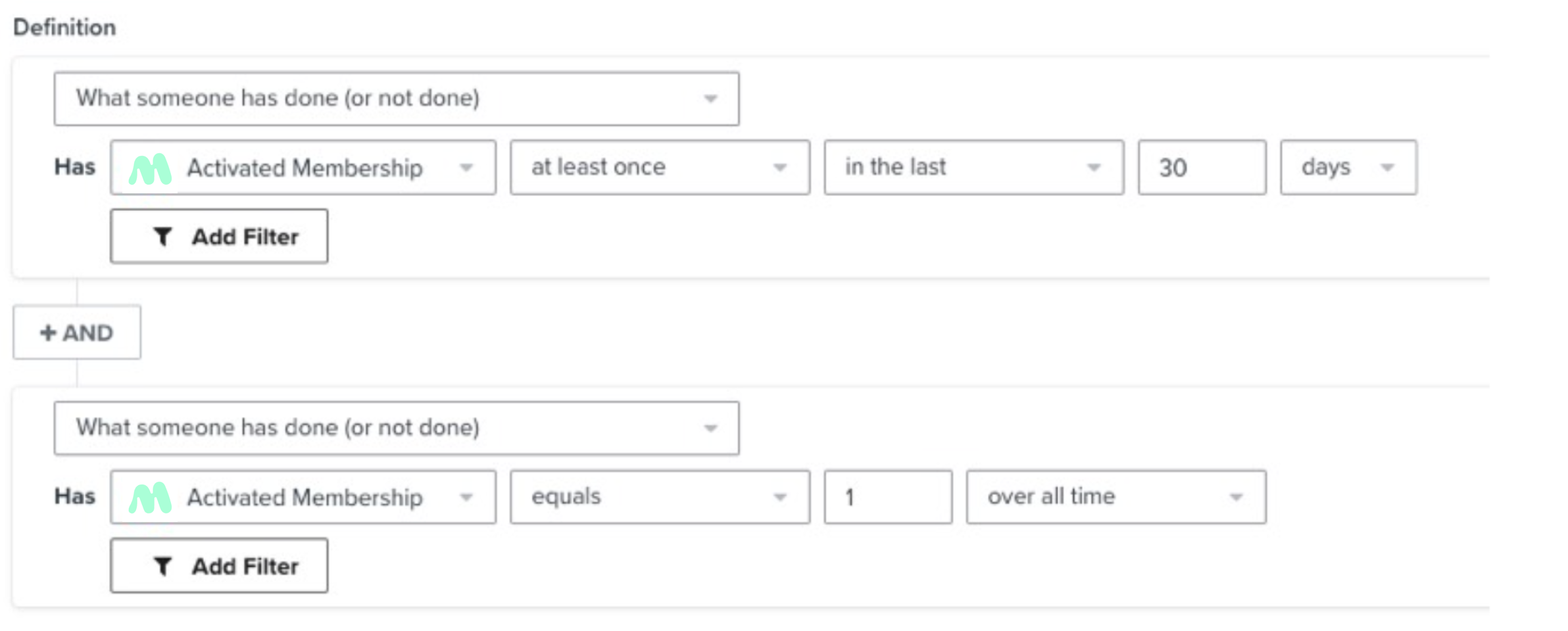 - 조건 추가 누군가가 수행한 작업(또는 수행하지 않은 작업) > 활성화된 멤버십 > = > 1 > 모든 시간 동안. 멤버십을 한 번 이상 활성화한 사람은 제외됩니다.