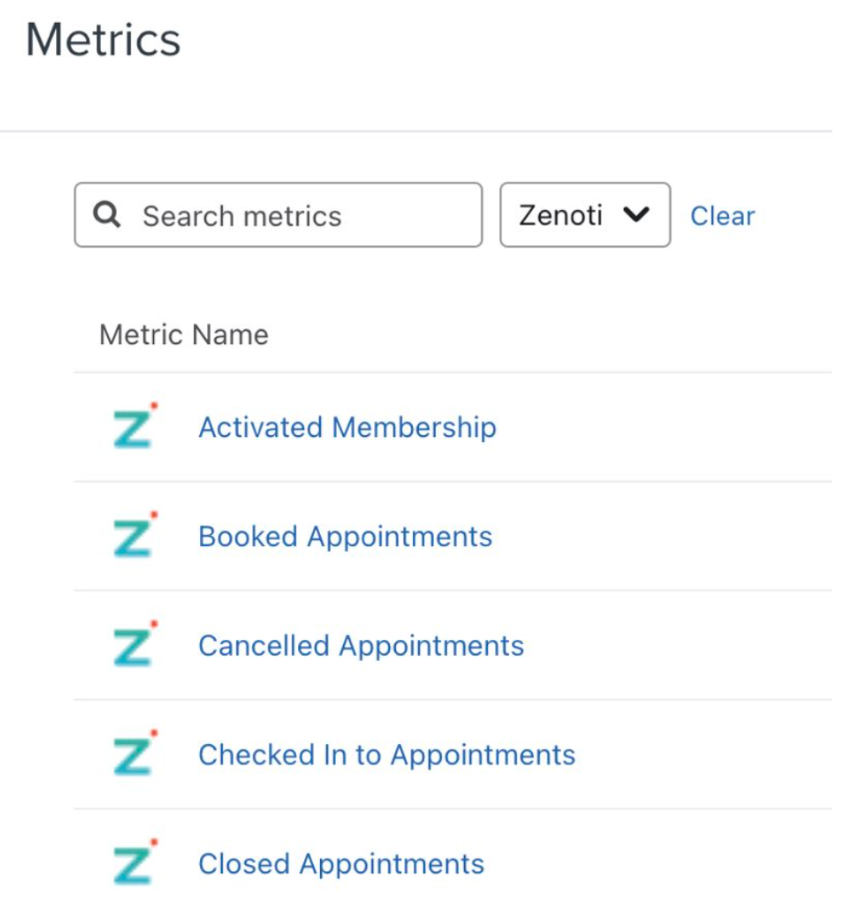 - 지표를 선택합니다. 여기에서 계정의 모든 지표를 확인할 수 있습니다. Zenoti 아이콘이 표시된 지표는 Zenoti 연동에서 동기화된 모든 지표를 나타냅니다.