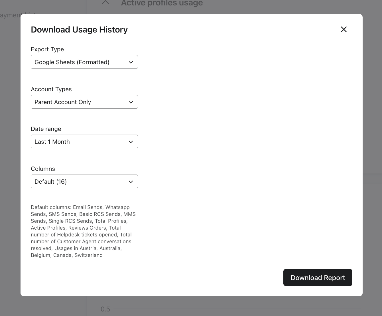 과거 계정 사용 내역에 대한 자세한 보고서를 원하시면 여기에서 사용 내역 보고서를 다운로드할 수 있습니다. 보고서의 형식은 CSV 또는 Google 스프레드시트로 지정할 수 있습니다.