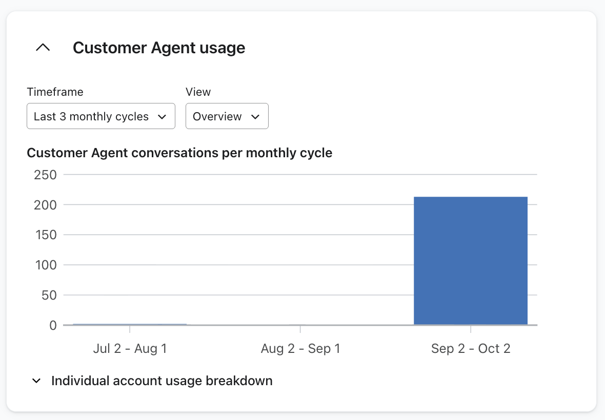계정 사용량 검토 방법은 Klaviyo 에서 확인하세요. 모든 비계약 계정(공유 청구 사용 계정 포함)의 경우 계정 사용량 탭에서 해당 계정의 각 요금제별 사용량(예: 보낸 이메일 및 문자 메시지 수)을 자세히 확인할 수 있습니다.
