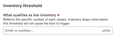 예를 들어, Shopify에서는 전체 제품(예: 티셔츠) 또는 특정 이형 상품(예: 검정 티셔츠)의 재고가 부족할 때 트리거되도록 플로우를 설정할 수 있습니다. 자세한 내용은 아래 차트를 참조하세요.