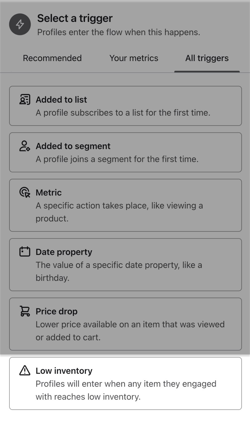 - 플로우 빌더에서 모든 트리거 탭에서'재고 부족'을 선택합니다.