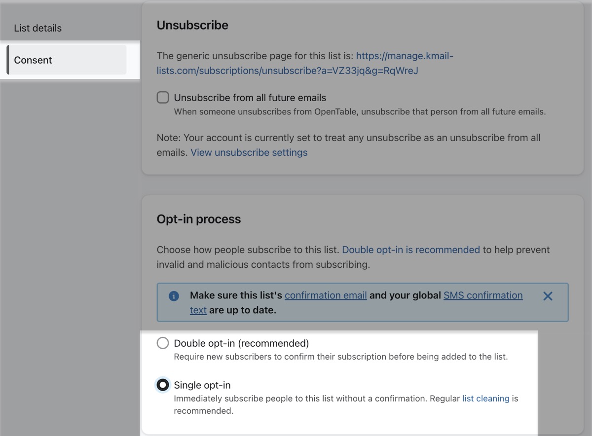 - 왼쪽의 동의 탭으로 이동하여 목록을 단일 옵트인으로 설정합니다.