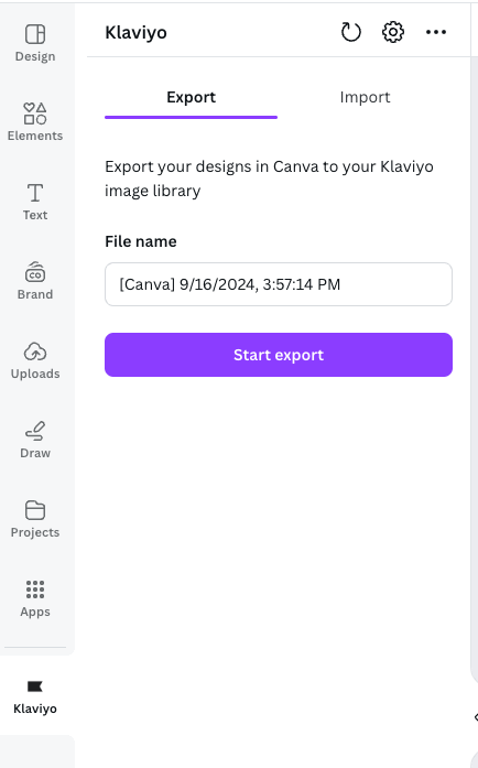 - 한 명의 Canva 사용자는 한 번에 하나의 Klaviyo 계정에만 연결할 수 있습니다(Canva 팀당). 따라서 여러 개의 Klaviyo 계정으로 작업하는 경우 이미지를 수동으로 내보내고 업로드하는 것이 가장 좋습니다.