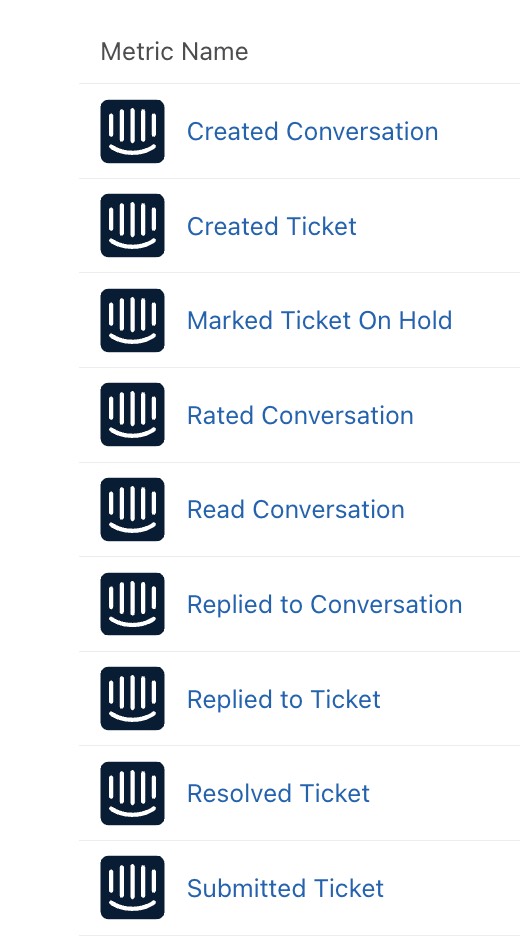- 메트릭을 선택합니다. 여기에서 계정의 모든 메트릭을 볼 수 있습니다. 인터콤 아이콘이 있는 애널리틱스는 인터콤 연동에서 동기화된 모든 애널리틱스를 나타냅니다.