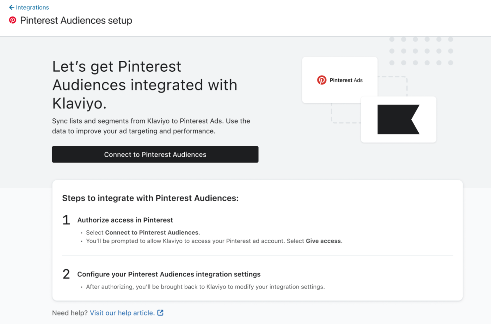 - Klaviyo 계정당 1개의 Pinterest 광고 계정만 통합할 수 있습니다.