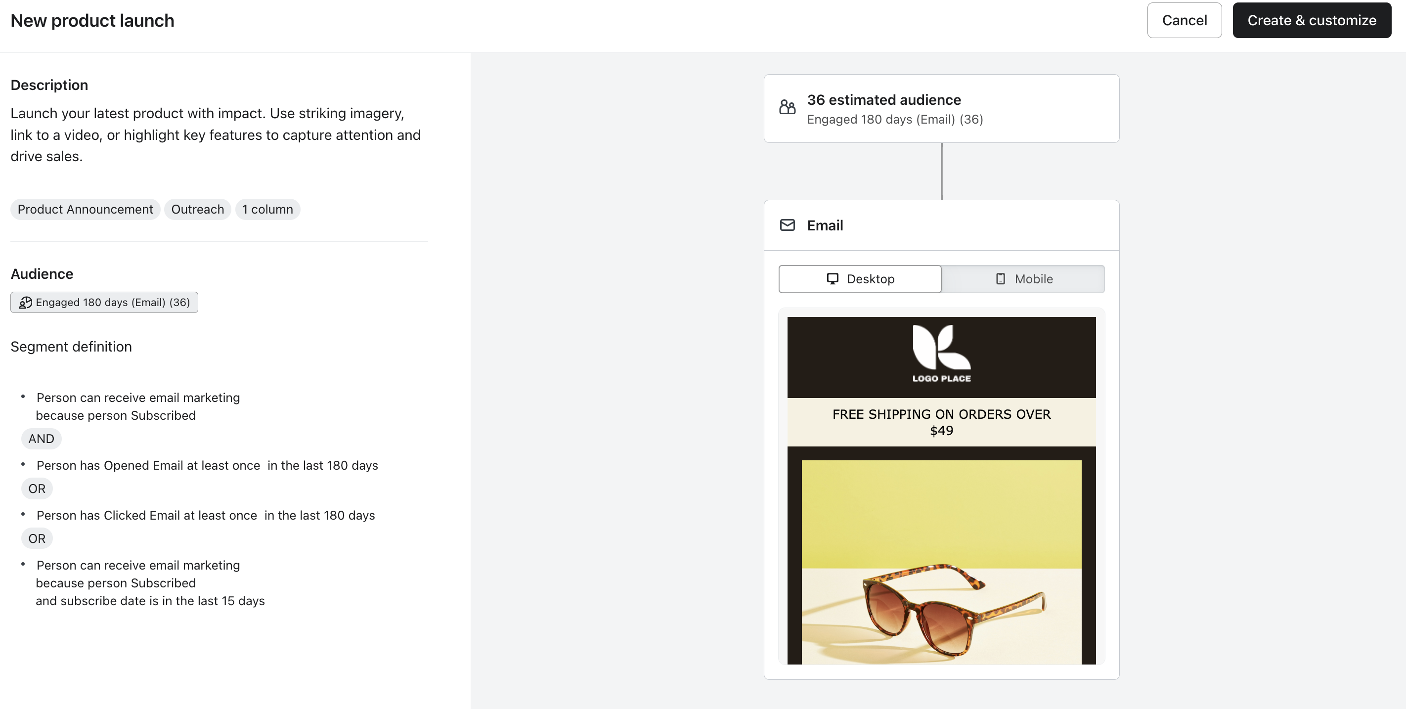 오른쪽에는 예상 대상자 규모와 캠페인에 사용된 이메일 콘텐츠의 미리보기가 표시됩니다. - 오른쪽 상단의 & 사용자 지정 생성을 클릭하여 캠페인 설정 마법사를 계속 진행합니다.