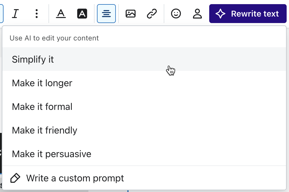 이메일 AI는 텍스트 블록을 수정하여 어조, 길이 또는 스타일을 변경할 수 있습니다. 이 기능을 사용하여 글쓰기 블록을 치료하거나, 기존 초안을 개선하거나, 다양한 대상에 맞게 사본을 조정할 수 있습니다. Klaviyo의 기본 프롬프트(예: 간소화, 길게 만들기)를 사용하거나 직접 프롬프트를 작성할 수 있습니다.