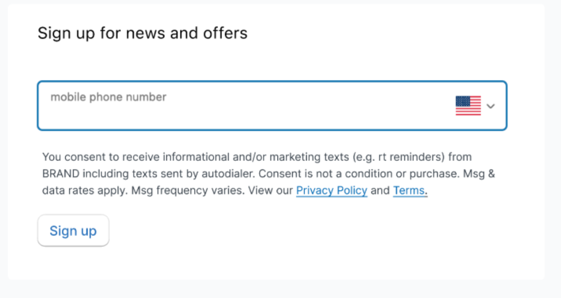 거래 수집 방법 SMS 알아보기 Shopify 결제, 감사, 주문 상태 페이지에서 동의를 Klaviyo 받고 에 동기화합니다. 이 페이지에서 거래 및 마케팅 SMS 동의를 모두 수집할 수 있습니다. SMS 앱 블록을 통해 Klaviyo 에서 설정한 다음 Shopify 에 설치합니다.
