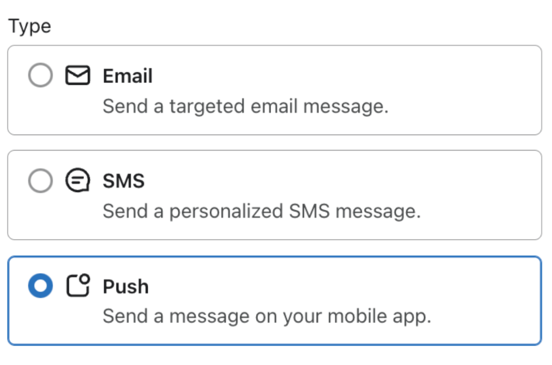 - 캠페인의 이름을 지정하고 푸시를 유형으로 선택합니다.