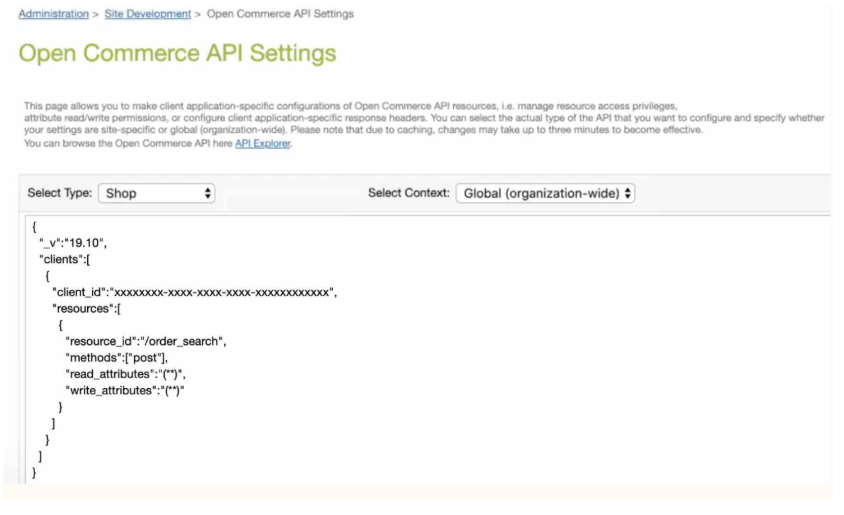 설정이 추가되면 다음과 유사하게 표시됩니다:{ "_v":"SHOP_API_VERSION", "clients":[ { "client_id":"CLIENT_ID", "resources":[ { "resource_id":"/order_search", "methods":["post"], "read_attributes":"(**)", "write_attributes":"(**)" } ] } ] } -