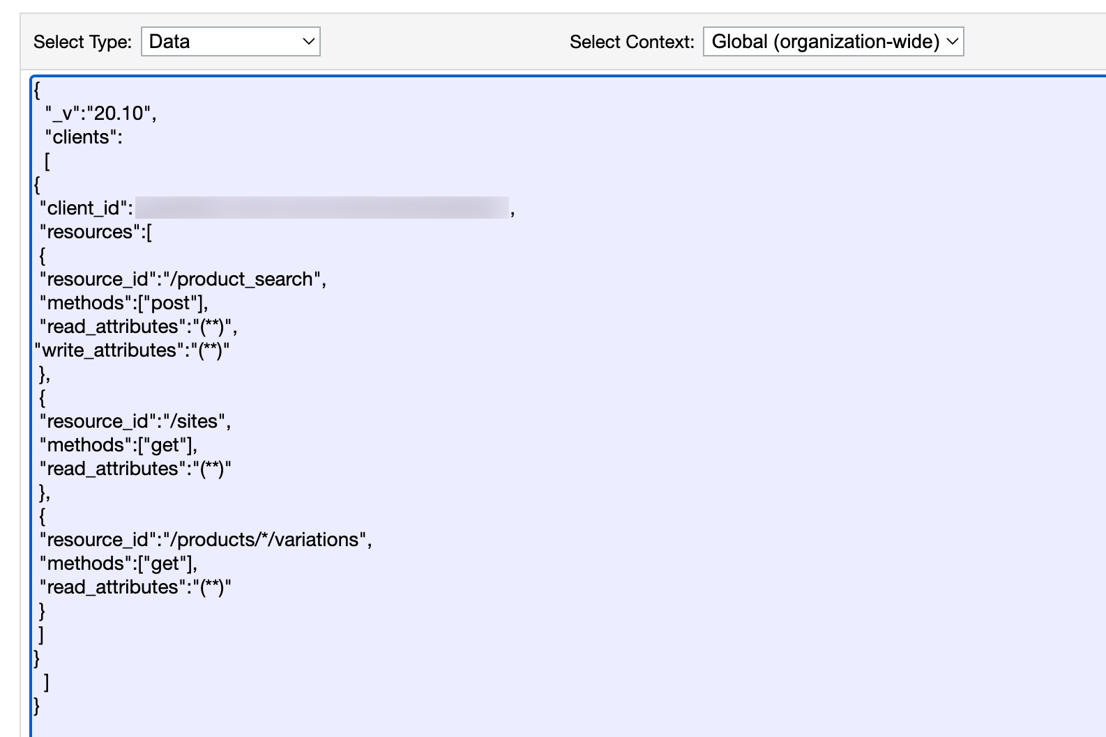 설정이 추가되면 다음과 유사하게 표시됩니다:{ "_v":"DATA_API_VERSION", "clients":[ { "client_id":"CLIENT_ID", "resources":[ { "resource_id":"/product_search", "methods":["post"], "read_attributes":"(**)", "write_attributes":"(**)" }, { "resource_id":"/sites", "methods":["get"], "read_attributes":"(**)", }, { "resource_id":"/products/*/variations", "methods":["get"], "read_attributes":"(**)", } ] } ] }