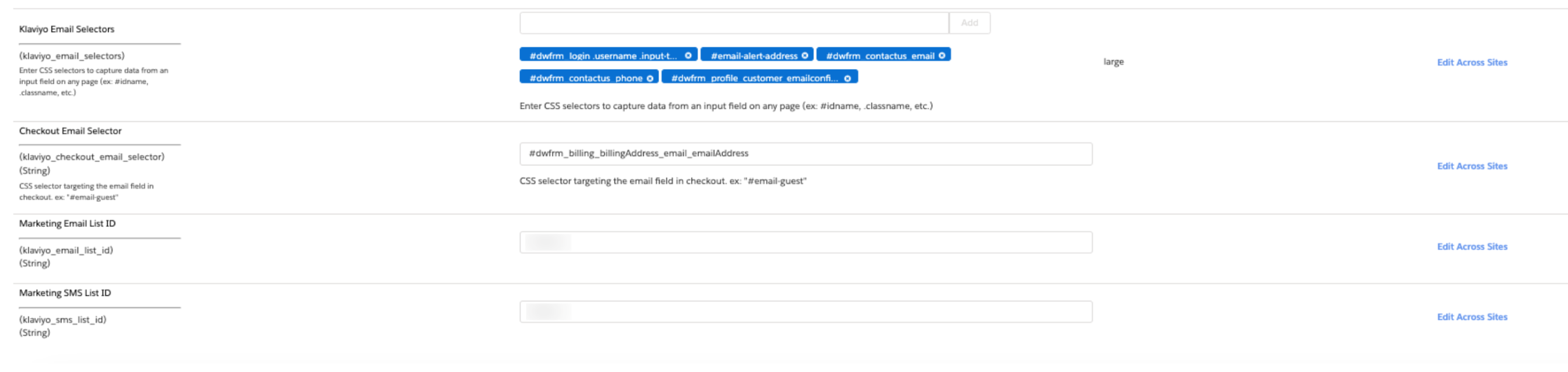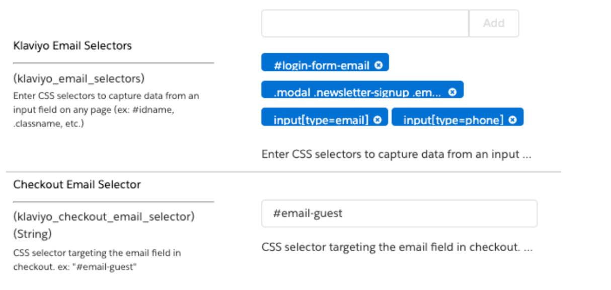 Klaviyo 이메일 필드 선택기 사이트 기본 설정은 사이트의 모든 이메일 및 전화번호 입력란(아래에서 다루는 결제에 있는 이메일 입력 제외)을 대상으로 지정하는 데 사용됩니다. 표준 CSS 선택기를 통해 이러한 필드를 식별하며, 각 필드는 사이트 기본 설정에 개별적으로 추가됩니다('문자열 집합'으로 여러 문자열 값을 하나씩 입력할 수 있음). 표준 스타일시트에서 특정 요소를 타깃팅하는 데 사용할 수 있는 복잡한 선택기(예: #dwfrm_login div.username input.input-text)는 물론, 공유 속성을 기반으로 사이트 전체의 여러 요소를 타깃팅하는 선택기(예: 입력[type=이메일])도 사용할 수 있습니다. 동적으로 생성된 ID는 페이지 로드에 따라 변경되어 실패할 수 있으므로(예: #dwfrm_login_username_d0fignzngiyq) SiteGen에서 매우 일반적인 경우인 동적 ID를 통한 입력 타겟팅은 피해야 합니다.