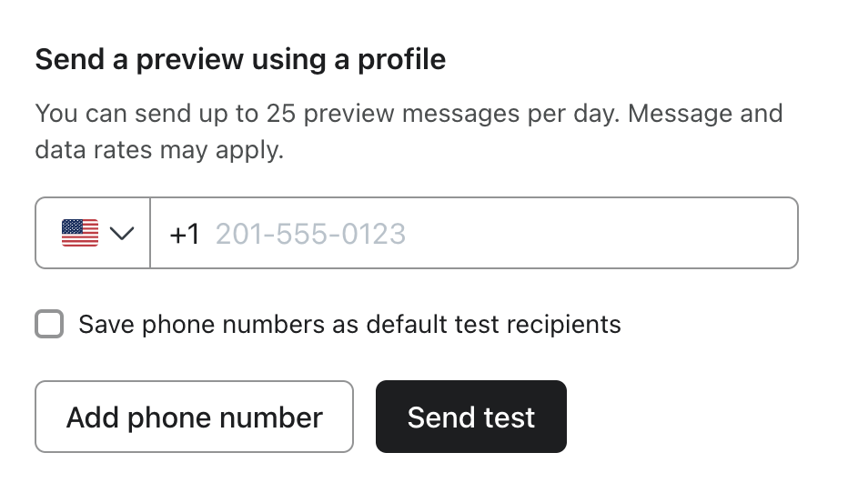 - 나중에 테스트에 해당 번호를 사용하려는 요금제를 사용하는 경우 전화번호를 기본 테스트 수신자로 저장 옵션을 선택합니다.