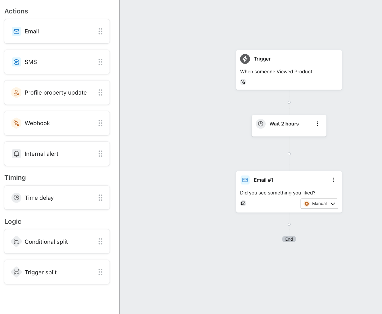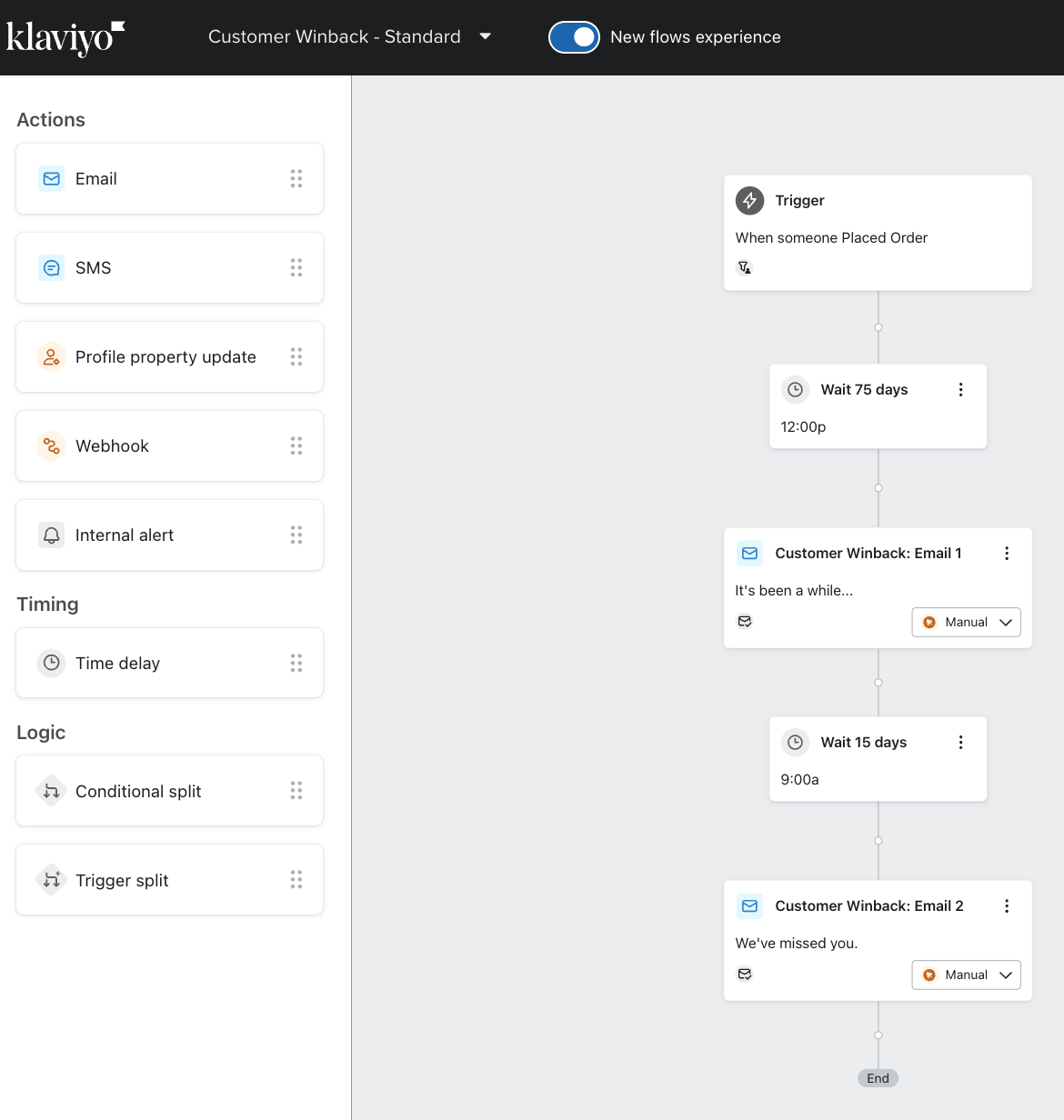 클라비요는 플로우 섹션에서 사전 구축된 고객 윈백 플로우를 제공하지만, 직접 쉽게 구축할 수도 있습니다.