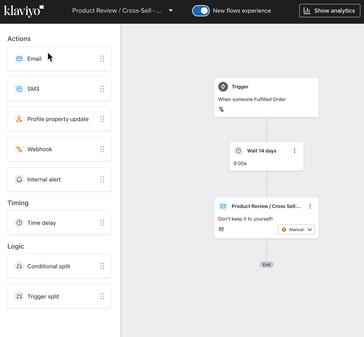 Klaviyo 는 Klaviyo 플로우 라이브러리에서 찾을 수 있는 사전 구축된 제품 리뷰/교차 판매 플로우를 제공합니다.