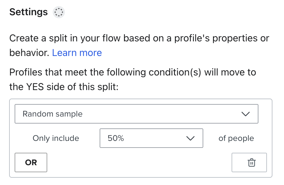 - 50개의 무작위 샘플(% )을 기준으로 분할을 구성합니다. 이렇게 하면 메시지 중 하나의 타이밍에 대해 A/B 테스트를 실행할 수 있습니다.