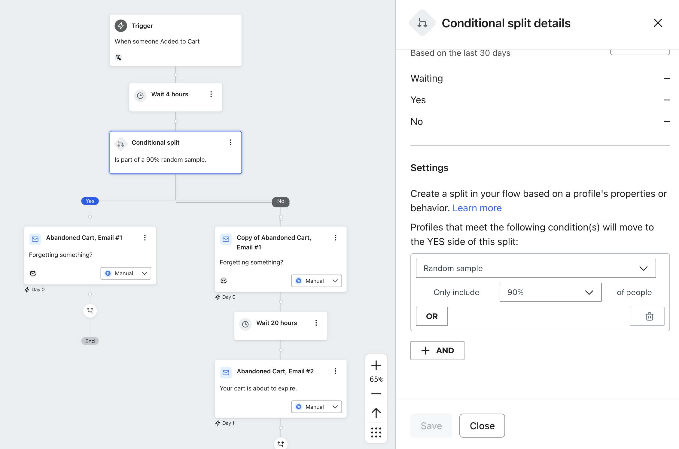 무작위 샘플의 가중치를 50이 아닌 다른 값으로 변경하면%, 이는 예 경로로 플로우하는 사람들의 비율이 된다는 점을 명심하세요. - 시간 지연을 플로우의 NO 브랜치로 드래그합니다. 테스트하려는 다른 기간으로 설정합니다.