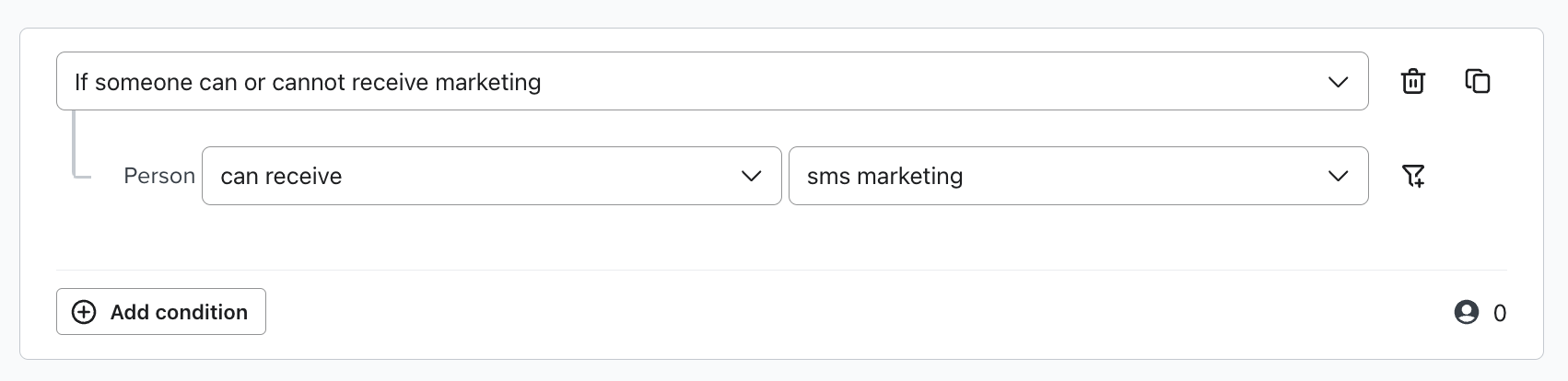 - 이 그룹을 제외하지 않으면 SMS와 이메일 모두에 동의한 모든 사람이 메시지를 두 번 받게 됩니다. 또한 SMS 구독자는 제외되므로 이 캠페인의 대상자를 정확하게 파악할 수 있습니다.