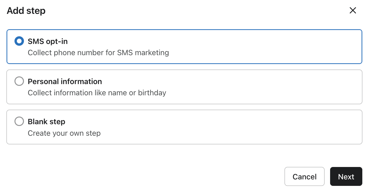 일반적으로 더 많은 사람들이 기꺼이 이메일을 작성할 것이므로 첫 번째 단계로 이메일을 수집합니다. 그런 다음 SMS를 위한 두 번째 단계를 추가합니다.