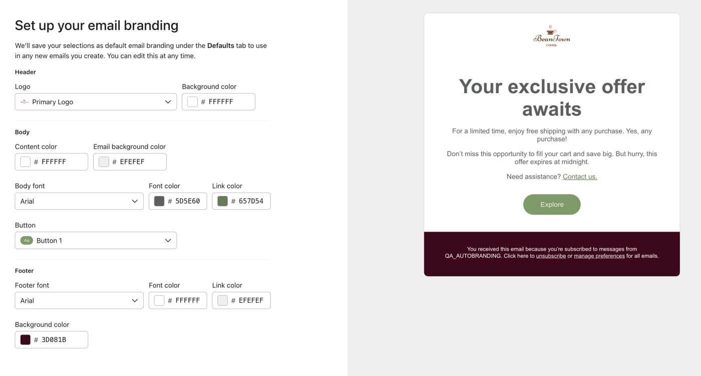 - 이메일 템플릿에 브랜드를 설정하세요. 헤더, 푸터 및 본문의 내용은 이전 단계에서 입력된 요소로 자동으로 채워지지만, 필요에 따라 수동으로 변경할 수 있습니다.