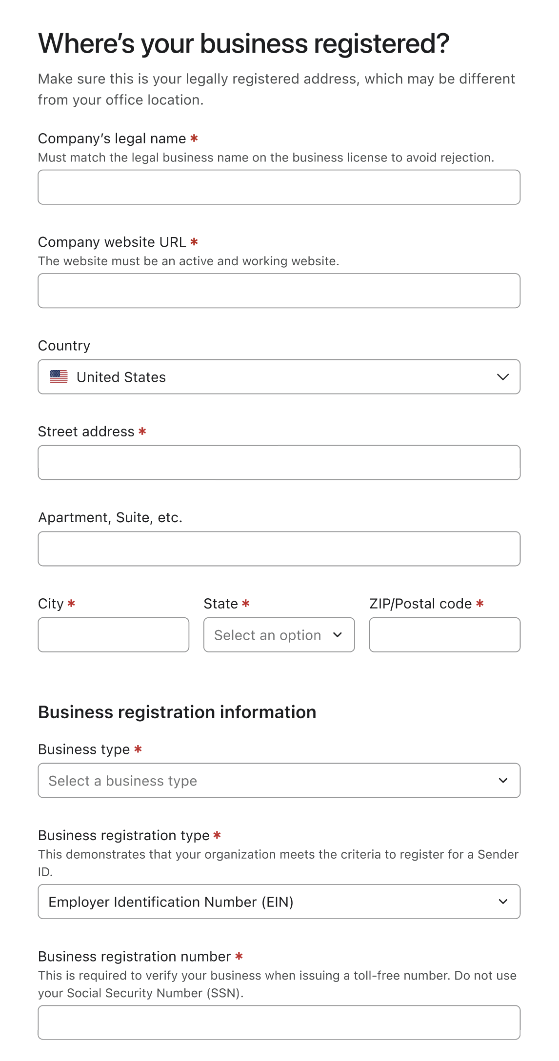 - 일부 국가에서는 발신 번호를 사용하기 전에 인증 또는 등록을 해야 합니다. 여기에는 다음이 포함됩니다.
