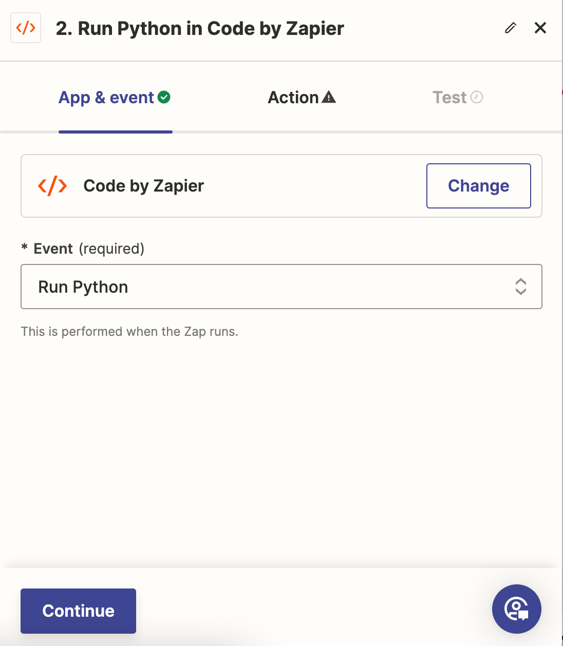 이 가이드에서는 트리거가 감지되면 Python 스크립트를 실행하는 Zapier 코드 액션을 사용합니다. 이 솔루션을 사용하면 클라비요 엔드포인트에 필요한 데이터 유형, 특히 구독 프로필 및 구독 취소 프로필 엔드포인트에 필드를 매핑할 수 있습니다.