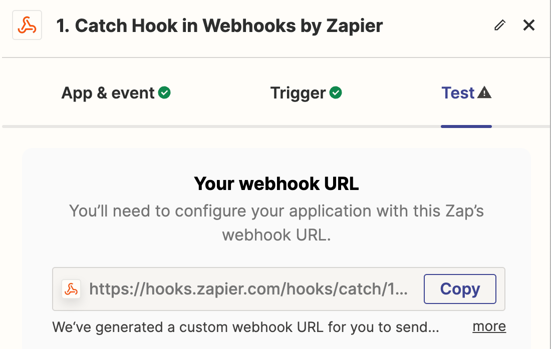 - 요청을 보낼 수 있도록 Zapier에서 제공하는 웹훅 URL을 복사합니다.