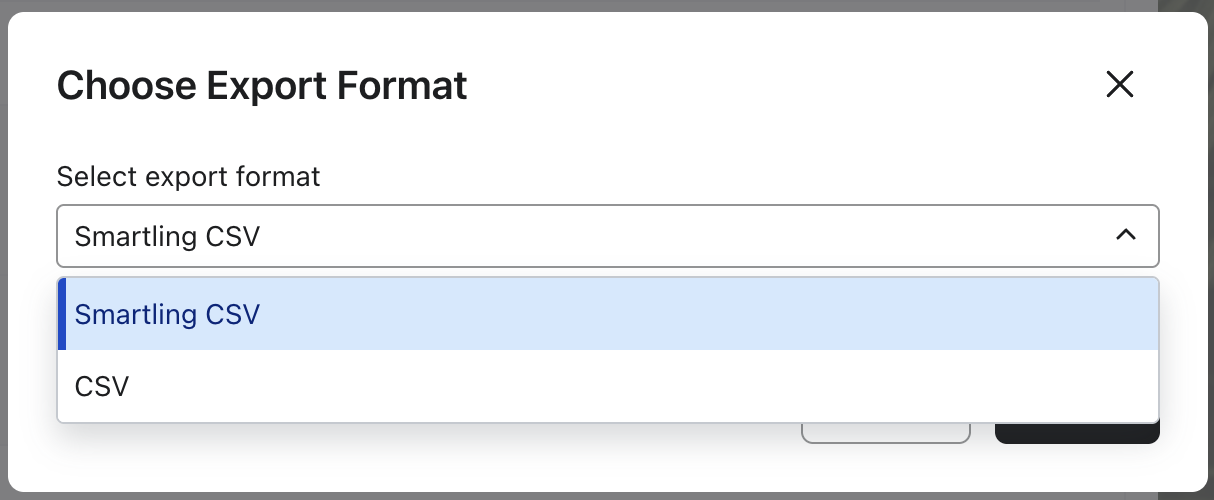 - 내보내기 모달을 보면 Smartling CSV 또는 CSV 중에서 선택할 수 있는 옵션이 있습니다.