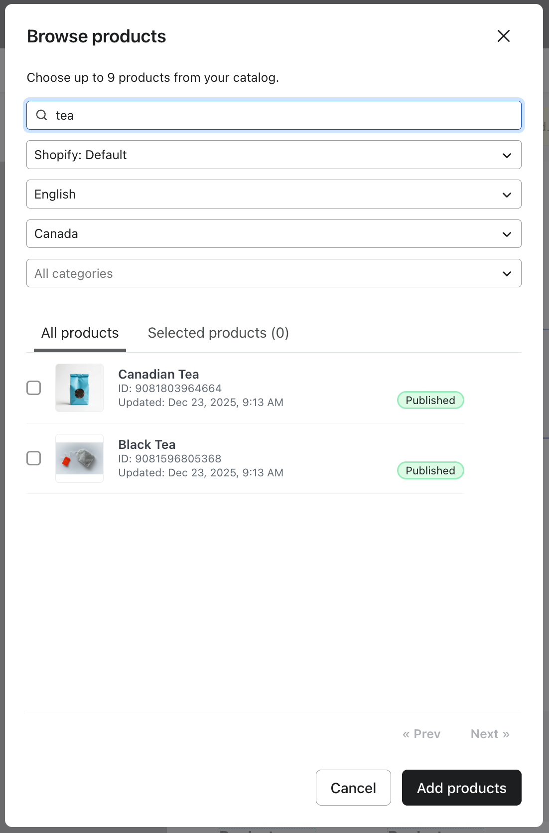 - 정적 제품 블록 선택기에서 로캘 인식 카탈로그를 선택합니다. Shopify 연동의 경우 카탈로그 이름은 "Shopify: 기본값"입니다.