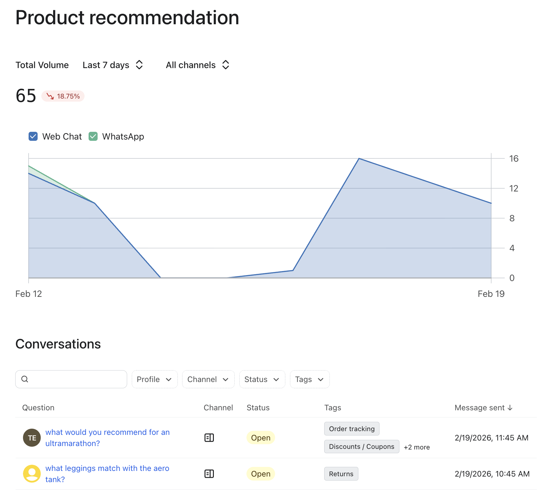 스킬은 모든 채널에서 작동하나요? 핵심 기술(주문 추적, 쿠폰 & 할인, 일반 문의&답변, 제품 추천)은 웹챗, SMS, 이메일에서 작동합니다. 구매 후 기술(반품 & 교환, 주문 편집, 구독, 로열티)은 웹챗과 SMS에서 사용할 수 있습니다. 채널 지원은 시간이 지남에 따라 확대될 수 있습니다.