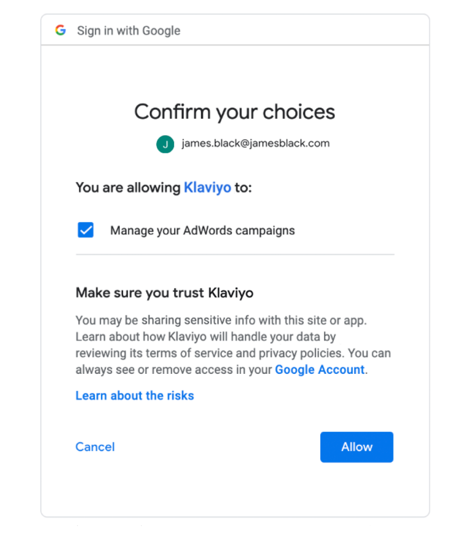 - 연동이 완료되면 받은 편지함에 google.integrations@klaviyo.com 으로부터 Google 광고 관리자 연결 요청이 표시되며, 이를 수락해야 합니다.