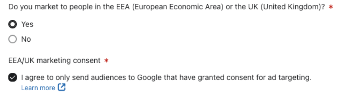 - EEA 또는 영국에 거주하는 사람들을 대상으로 마케팅하는 경우, 디지털 시장법에 따라 광고 타겟팅에 동의한 잠재고객만 Google에 전송하는 데 동의해야 합니다.