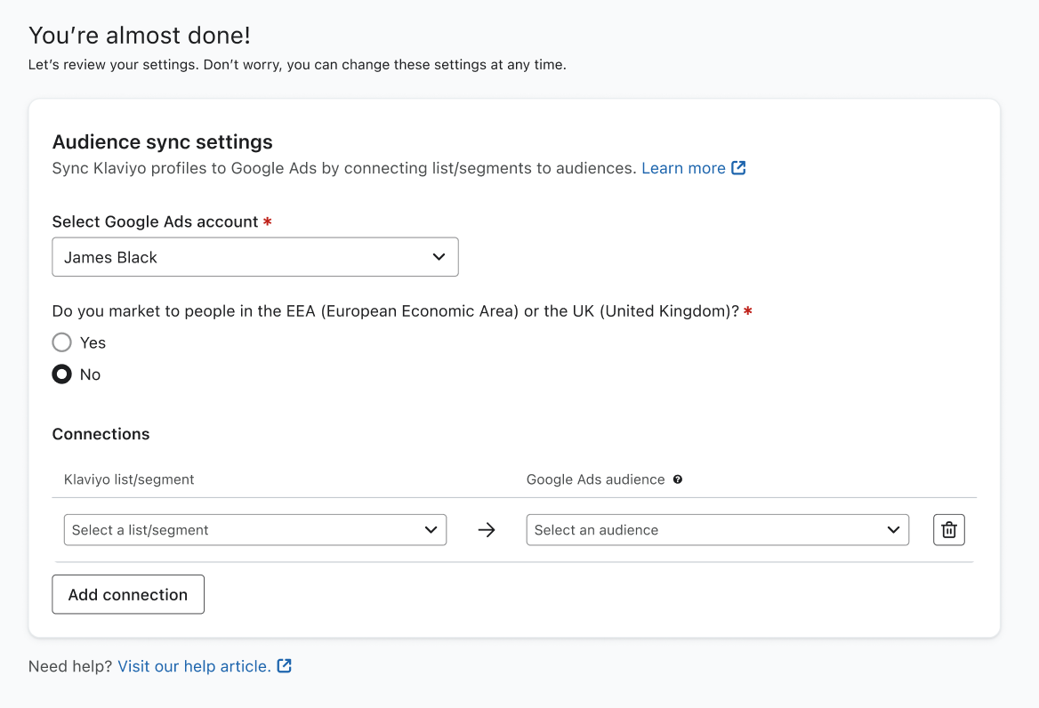 - 연결을 추가하려면 연결 추가를 클릭합니다. 언제든지 이 설정 페이지로 돌아가서 연결을 추가할 수 있습니다. 또한 이것은 1:1 동기화이므로 여러 개의 클라비요 목록 또는 세그먼트에 대해 동일한 Google 오디언스를 선택할 수 없으며, 동일한 클라비요 목록 또는 세그먼트를 여러 개의 Google 오디언스에 연결할 수 없습니다.