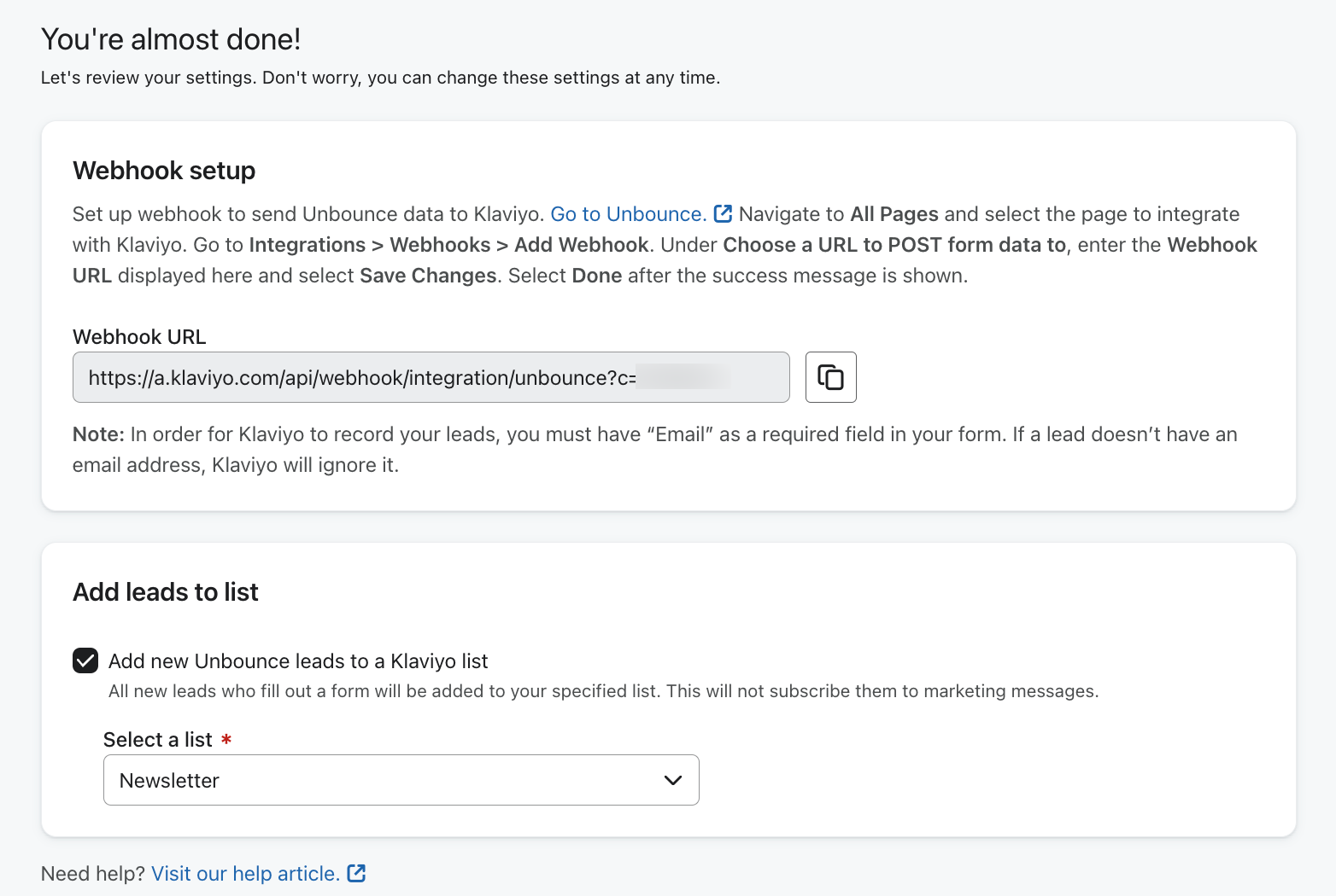 - Kopieer de webhook URL onder webhook Setup. Deze URL wordt in het volgende gedeelte gebruikt om een webhook naar Klaviyo in Unbounce te maken.