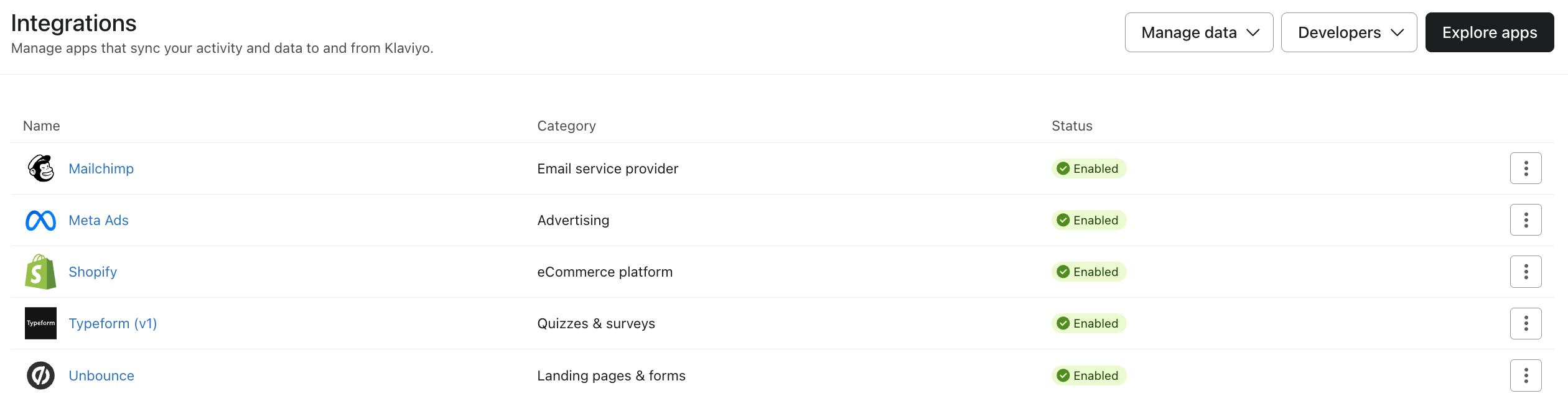 Op de resulterende pagina kun je de integraties bekijken die momenteel voor jouw account zijn ingeschakeld.