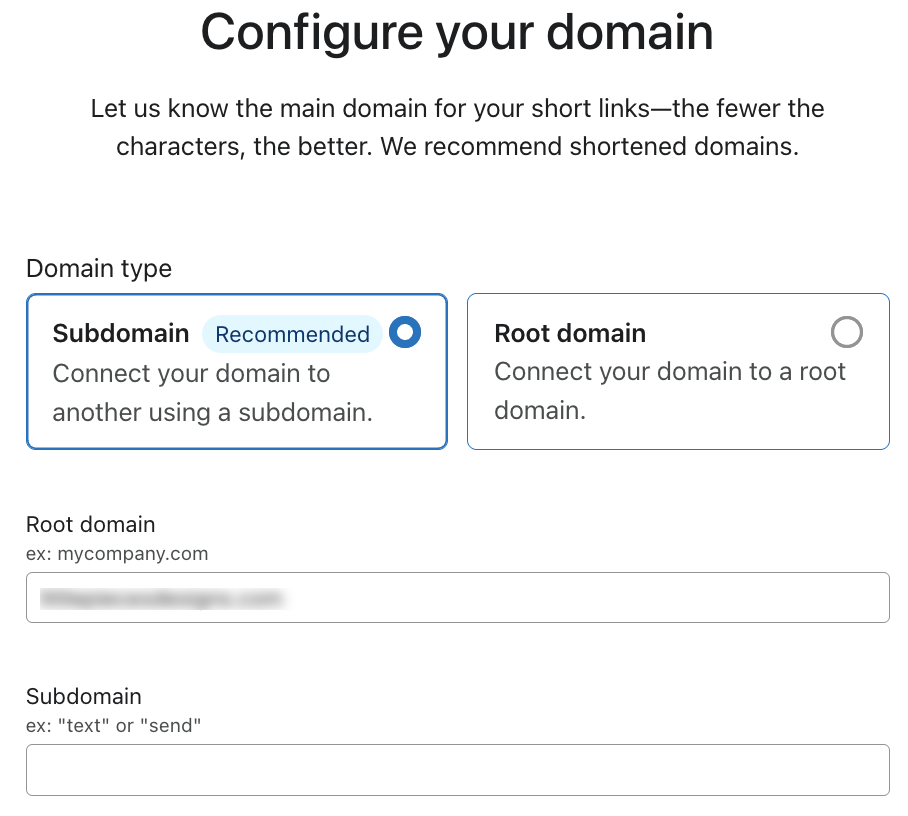 - Voer rechts onder Subdomein in wat je als merknaam in je verkorte links wilt hebben (bijv. jamesblack).