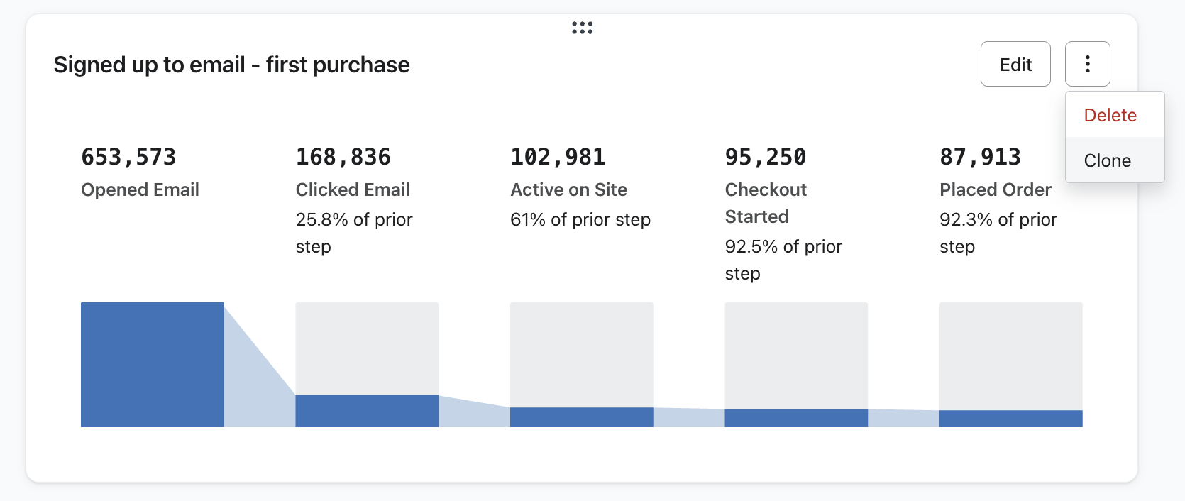 Je kunt trechter ook klonen zodat je snel kunt itereren zonder trechter helemaal opnieuw te hoeven maken. Om een bestaande trechter te klonen, klik je op het actiemenu (d.w.z. het menu met 3 punten) en selecteer je de optie klonen .