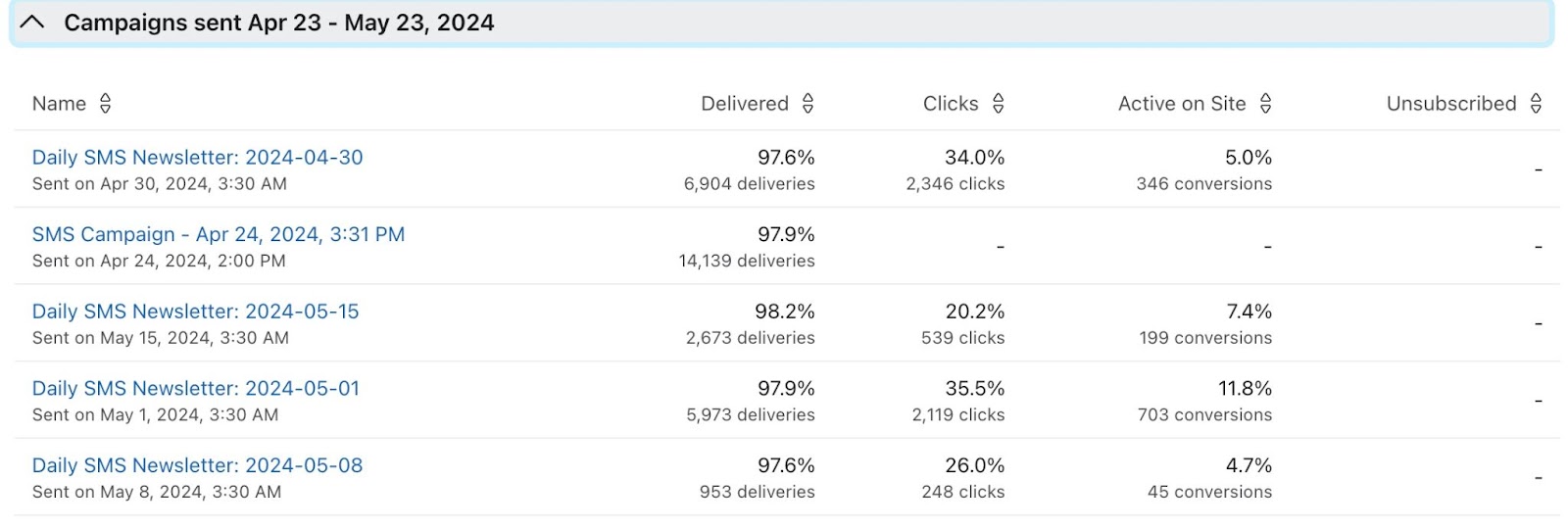 De verzonden campagnes of stroom binnen tabellen weerspiegelt de periode die je hebt gekozen voor je dashboard. Hier kun je de bezorgdheid, kliks, je conversie meetwaarde en afmelden per sms campagne of flow bekijken, samen met de totale aantallen en percentages die ze vertegenwoordigen.