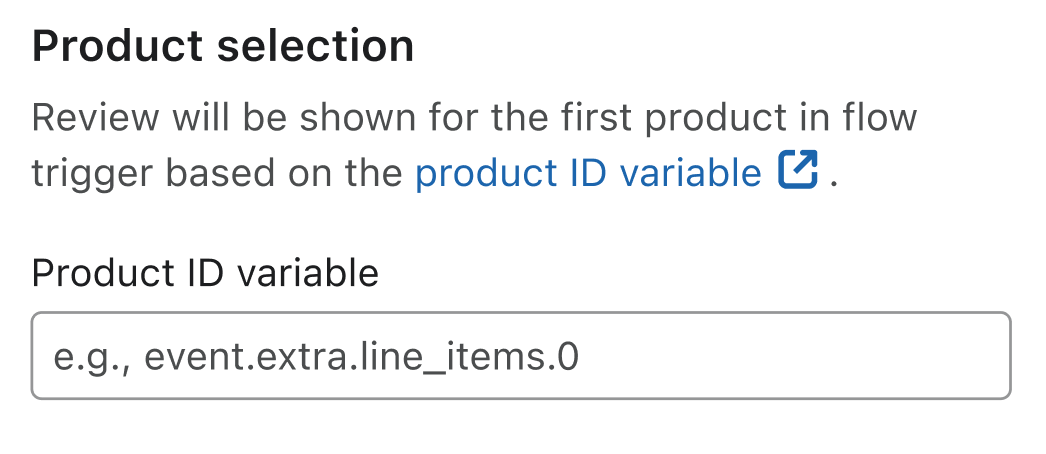 Leer hoe je een product-ID variabele selecteert om dynamische beoordelingsquotes weer te geven die gerelateerd zijn aan de producten waarin iemand geïnteresseerd is. Deze variabelen verschillen per evenement, dus zorg ervoor dat je de juiste variabele gebruikt voor je flow.